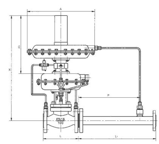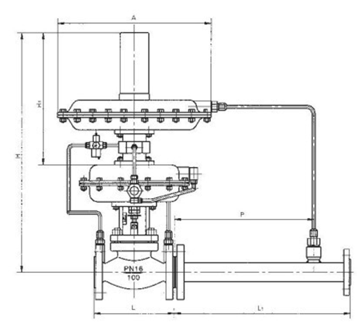 自力式帶指揮器型壓力調節閥由控制閥(主閥)、執行機構、指揮器三部分組成,依靠被調介質自身的壓力為動力源達到自動調節和穩定壓力的目的,適用于大可調比,大壓差的減壓穩壓場合。